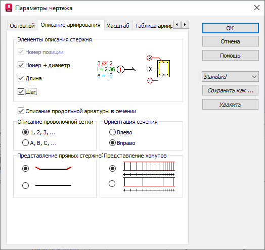 - В диалоговом окне «Параметры чертежа» перейдите на вкладку «Описание арматуры» и задайте необходимые параметры.