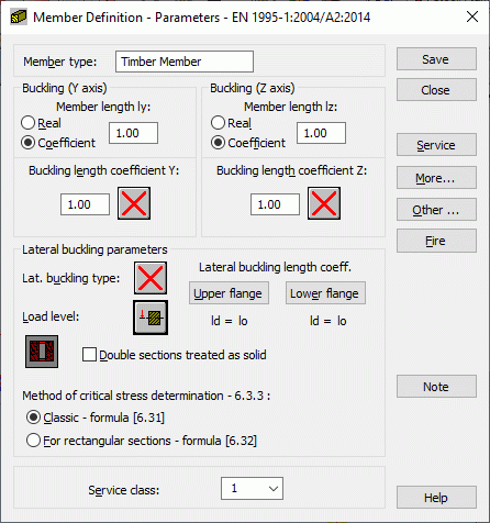 Это диалоговое окно используется для определения параметров элементов из древесины по нормам EN 1995-1:2004/A2:2014. Опция становится доступной при выборе Новый тип элемента в диалоговом окне Тип элемента или, нажав на кнопку Параметры в диалоговом окне Определение.