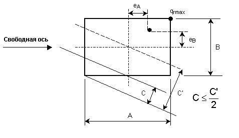 Обобщенная диафрагма была введенна для ограничения допустимого люфта под фундаментом, когда возникает отрыв 2.3 a. Нормы допускают для люфта между породой и основанием фундамента величину, которая определяется следующим образом. Эта величина не может превышать половины расстояния C' между прямой линией, проходящей параллельно нейтральной оси через центр тяжести всего основания, и наиболее удаленной точкой основания, которая лежит напротив той точки, в которой появляется максимальное значение нагрузки q rmax . Поэтому допустимое относительное значение люфта для диафрагмы II равно 0.5 и получается из отношения C/C'. Для простого случая eB = 0, C = A/4, a C' = A/2.