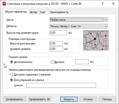 Откройте диалоговое окно "Снеговые/ветровые нагрузки" на вкладке "Общие параметры", чтобы открыть следующее диалоговое окно: