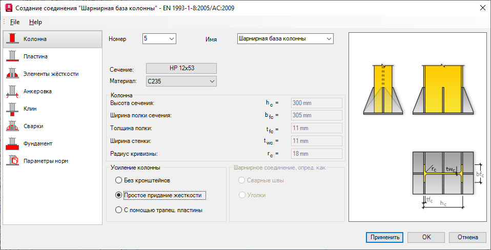 Закладку Колонна используют для того, чтобы определять основные характеристики узла: