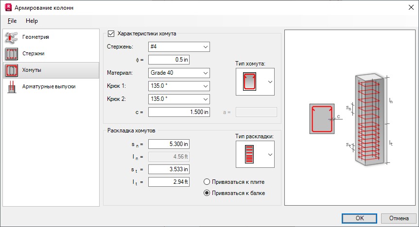 Здесь определяются характеристики поперечной арматуры (хомутов) колонны: