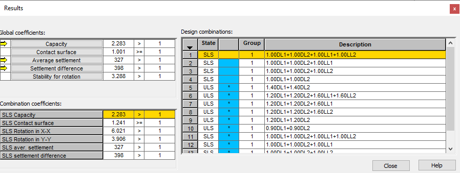 В поле Общие коэффициенты располагаются шесть кнопок: Грузоподъемность, Поверхность контакта, Сопротивление проскальзыванию, Сопротивление опрокидыванию, Средняя осадка грунта и Сопротивление продавливанию и сдвигу. Наиболее неблагоприятные коэффициенты для соответствующих типов проверки фундаментов представлены в полях, расположенных справа от кнопок. В результате нажатия на соответствующие кнопки подсвечиваются комбинации, для которых в поле Комбинации проекта был получен представленный коэффициент запаса.