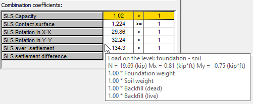Если значение коэффициента выражено символом INF (неопределенный), это означает, что это условие не используется при проектировании фундамента на естественном основании или ленточного фундамента. Используемые нагрузки не приводят к вращению естественного основания или ленточного фундамента.