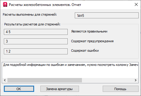 Если расчет ж/б элементов вызвал ошибки или предупреждения, то в нижней части диалогового окна будет выведена информация о том, где можно получить сведения об этих ошибках и предупреждениях.
