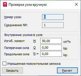 После нажатия кнопки Расчет программа производит расчеты выбранного типа соединения для заданного узла конструкции. Будут определены внутренние усилия в соединении (N, Q, M).