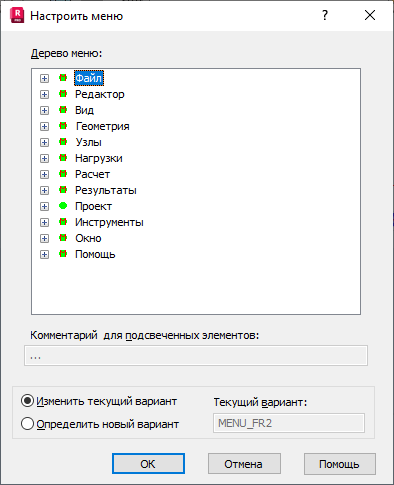 В верхней части диалогового окна располагается дерево меню. Зеленым кружком отмечены опции, доступные из меню в данный момент. Красный кружок обозначает опции, в данный момент недоступные. Выбором соответствующей опции пользователь может изменить цвет кружка и тем самым добавить опцию в меню или удалить ее из меню. Зеленый кружок с буквой М означает, что опцию нельзя удалить.
