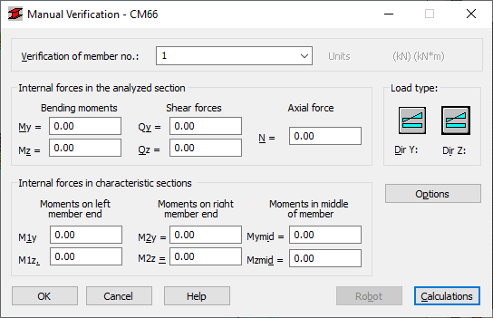 Диалоговое окно "Ручная проверка" позволяет выполнять проверку стального элемента по выбранным нормам для стальных конструкций (например, французским CM66, немецким DIN или Еврокод 3). Получить доступ к параметру можно, щелкнув
