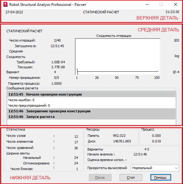 - Верхняя часть (не зависит от выбранного типа расчета и решателя), содержит следующую информацию: текущая дата и время, а также тип расчета конструкции. Дополнительно показывается название рассчитываемого проекта.