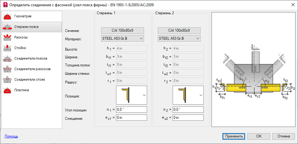 На вкладке "Стержни пояса" можно задать основные параметры стержней пояса, примыкающих к фасонке. Они включают: