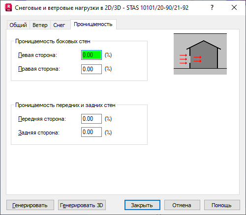 При переходе в диалоговом окне "Снеговые/ветровые нагрузки" на вкладку Проницаемость открывается следующее диалоговое окно.