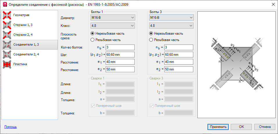 - диаметр и класс болтов, используемых для подсоединения стержня с фасонкой, расположение болтов на стержне и плоскость среза (при выборе болтового соединения);