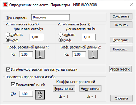 Это диалоговое окно позволяет определить параметры норм типа элемента в соответствии с нормами NBR 8800:2008.