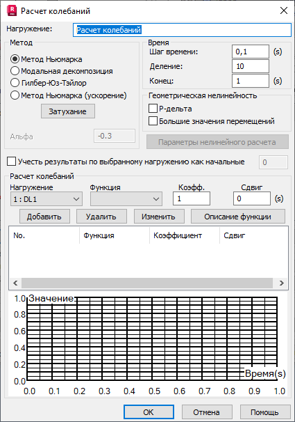 Если выбран метод отличный от модальной декомпозиции, то количество временных шагов (шаг времени сохранения результатов) задается в поле Деление для определения временного шага интеграции. Временной шаг интеграции равен Шаг времени / Деление. Если результат деления равен 1, временной шаг для сохранения результатов идентичен временному шагу интеграции.