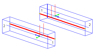 В случае 3D конструкций пользователь должен иметь в виду следующее: знаки локальной системы осей зависят от положения и направления стержневого элемента. Это показано на рисунке ниже. Два параллельных стержня имеют разные ориентации (начало стержня отмечено номером "1", а его конец – номером "2"). Такому положению стержней соответствуют противоположные знаки локальных осей x и y. В результате одна и та же жесткая вставка со значением Vpy (т. е. значением половины ширины сечения) в локальной системе координат приводит к противоположному смещению сечения в глобальной системе.