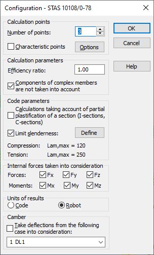 В центральной части диалогового окна можно выбрать внутренние усилия, которые учитываются в нормативных расчетах элемента; если включить опцию (например Fx), то усилие Fx будет учтено в расчетах. Кроме того, здесь можно выбрать единицы измерения для результатов расчета элемента. Результаты могут быть представлены в единицах, используемых в Румынских стальных нормах, или в единицах, используемых в системе Robot.