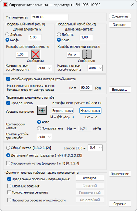 - Содержит параметры, используемые во время проверки продольного изгиба элемента: тип продольного изгиба, уровень нагрузки, критический момент и коэффициент расчетной длины.