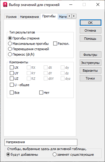 В области «Компоненты» можно выбрать следующие перемещения или прогибы стержней.