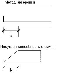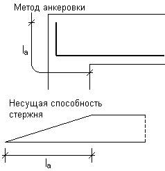 Если опция включена, то длина анкерованного стержня измеряется от конца стержня (нагрузка возрастает от нуля, до необходимого значения) с учетом длины изгиба. Изгиб создается, если на вкладке "Формы" были выбраны соответствующие формы продольного стержня и, если невозможно анкерование прямого стержня из-за слишком тонкой опоры. В таком случае, длина, необходимая для анкерования стержня, получена путем увеличения изгиба длины, так что общая длина крюка и не изогнутого сегмента обеспечивали необходимую нагрузку Если длина крюка взята для расчетов, возможные дополнительные коэффициенты, связанные с типоп конца стержня, не учитываются (стержень считается как не изогнутый).