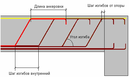 В нижней части диалогового окна имеется также опция Гнутые стержни. Если опция верхние гнутые стержни и нижние гнутые стержни включена, то гнутые стержни могут быть использованы во время расчета стержней армирования. Гнутые стержни создаются только если число плоскостей армирования больше чем одна и по крайней мере окончание одной из плоскостей находится в шаге.