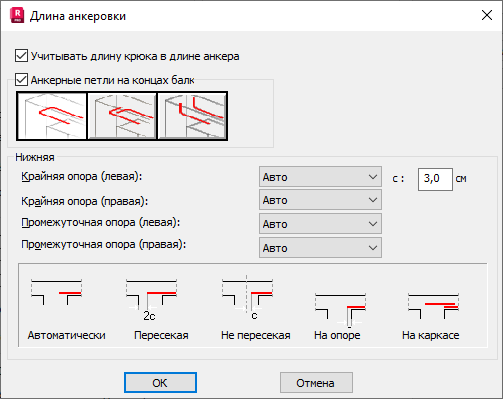 Анкеровка - дополнительная полезная опция в управлении армированием в слоях. При щелчке на кнопку Анкеровка открывается диалоговое окно, в котором определяются параметры анкеровки.