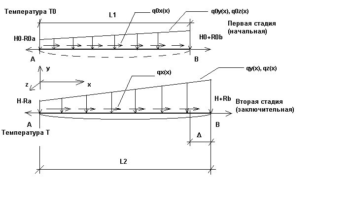 Рассмотрим гибкую ванту с малой величиной провисания (ванта, в которой угол между касательной в некоторой точке и прямой, соединяющей ее концы, мал) с произвольной нагрузкой, действующей в ее плоскости. Рассмотрим бесконечно малый элемент гибкой ванты, подверженный действию нагрузки q0, температуры T0 и натяжению H0. Пусть при этом длина элемента нити равна dso (рис. 1a). Когда к гибкой ванте приложена нагрузка (второй, окончательный этап нагружения с нагрузкой q, температурой T и натяжением H), длина элемента гибкой ванты становится равной ds (рис. 1b). Оба шага вместе с нагрузками в обеих плоскостях (xy и xz) представлены на рис. 2.