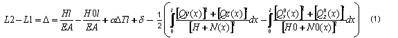 Заметим, что в уравнении каната (1), которое используется при расчете в противоположность традиционным решениям, продольная сила может изменяться по длине каната: в знаменателе обоих выражений, стоящих под знаком интеграла в уравнении (1), имеются следующие выражения: [H+N(x)] 2 and [H0+N0(x)] 2 . Это позволяет получить более точные результаты.