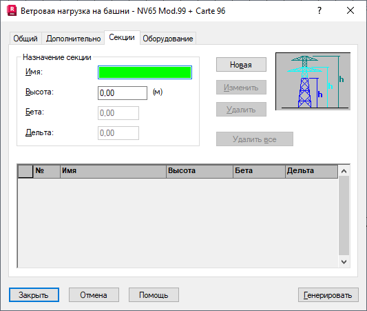 Открывают диалоговое окно Ветровые нагрузки на башни и выбирают вкладку Секции, тогда на экране появляется следующее диалоговое окно: