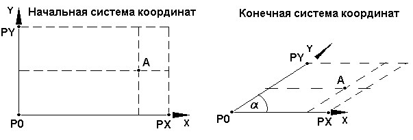 Если активизируется опция Ортогональные системы без масштабирования, то оси системы координат (оси x, y, z ) перпендикулярны как в первоначальной, так и в результирующей системе координат, оси систем координат не масштабируются. Длины сегментов, P0-PY P0-PX и P0-PZ идентичны в обеих системах координат.