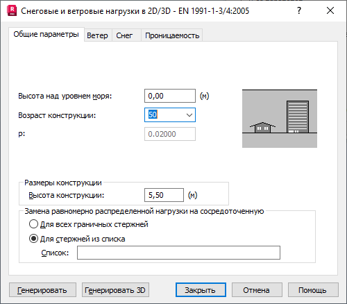 При переходе в диалоговом окне Снеговые/ветровые нагрузки на вкладку "Общие параметры" отображается следующее диалоговое окно:
