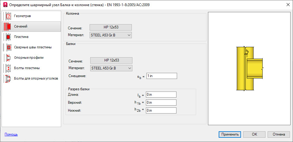 На вкладке "Сечения" определяются сечения для колонны и балки в соединении.
