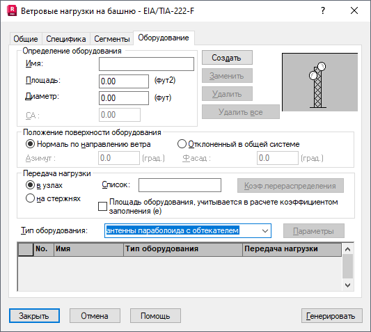 После открытия диалогового окна Ветровые нагрузки на башни и выбора вкладки Оборудование на экране появляется следующее диалоговое окно.