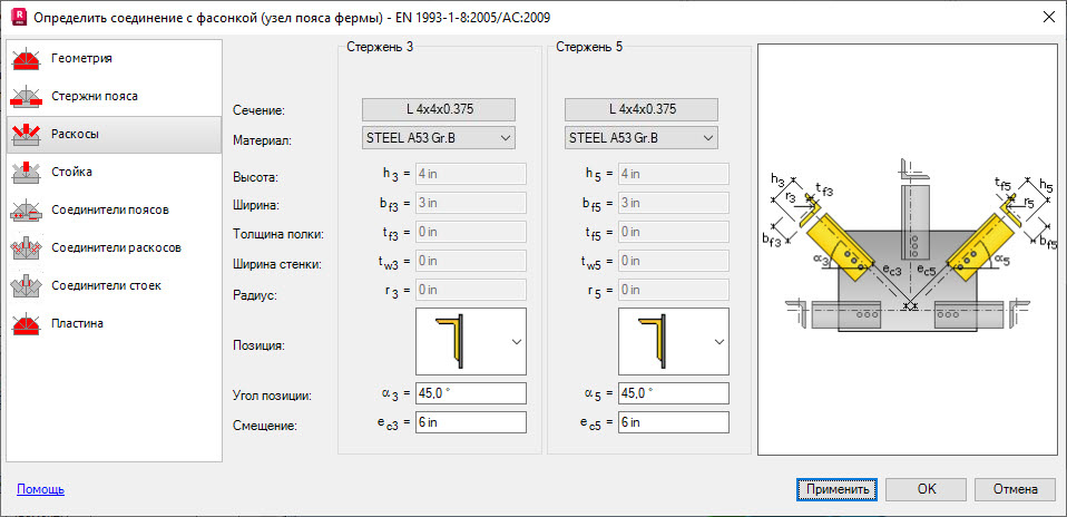 На вкладке "Раскосы" определяются основные параметры раскосов, примыкающих к фасонке. Они включают: