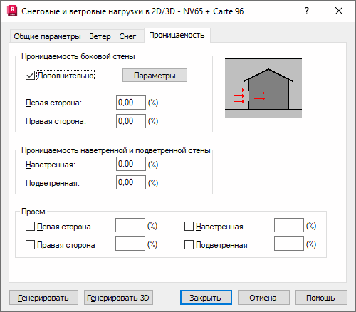 При переходе в диалоговом окне Снеговые/ветровые нагрузки на вкладку Проницаемость открывается следующее диалоговое окно.