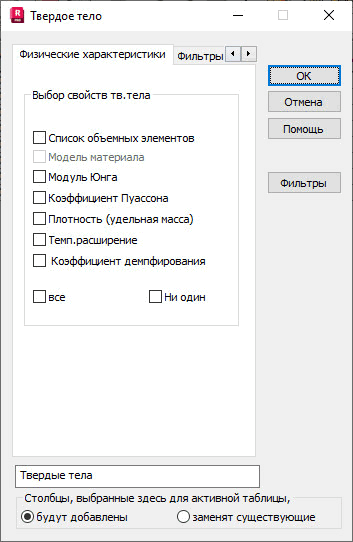 В этом диалоговом окне могут быть выбраны для представления в таблице следующие величины, относящиеся к твердым телам: