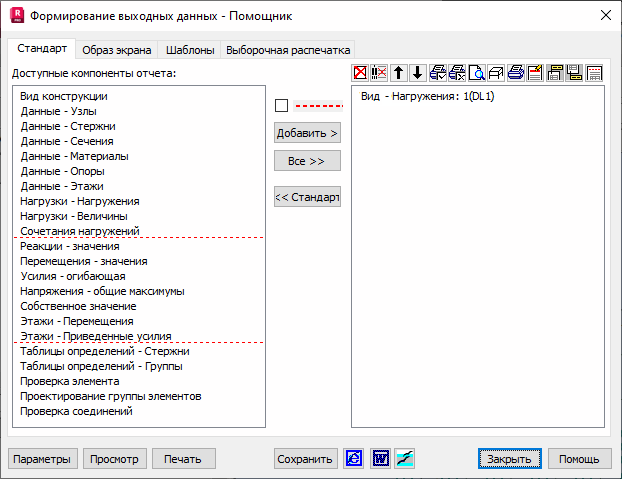 Диалоговое окно разделено на две панели: левую и правую. На левой панели представляются объекты, выбранные для печати (ее содержимое зависит от выбранной вкладки). Правая панель содержит полный отчет, составленный пользователем из объектов доступных на левой панели. Для подготовки содержимого распечатки перемещают объекты с левой панели на правую, используя две кнопки: Все и Добавить. При нажатии на кнопку "Все" все доступные объекты перемещаются вправо. При нажатии на кнопку Добавить с левой панели перемещаются только выделенные объекты. Если пользователь составляет необходимую ему распечатку и желает сделать ее состав стандартным, ему необходимо нажать на кнопку "Стандартная". Все компоненты, содержащиеся на правой панели, будут перенесены на левую панель вкладки "Стандартная".