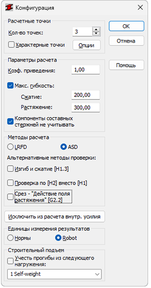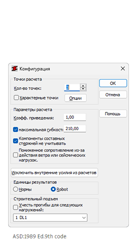 Если включен параметр «Пониженное сопротивление из-за действия ветра или сейсмических нагрузок», то программа автоматически увеличит прочность материала на 1/3 в соответствии с разделом A5.2 норм для простых ветровых и сейсмических вариантов нагружения, а также для сочетаний, содержащих такие варианты.