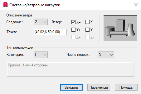 Опция позволяет создавать ветровые нагрузки, действующие на выбранные плоские конечные элементы и на плиты. Это означает, что прежде чем применить эту опцию необходимо выбрать плиты или конечные элементы, для которых будет создаваться ветровая нагрузка.