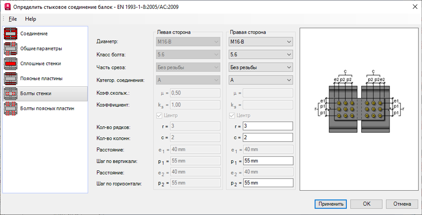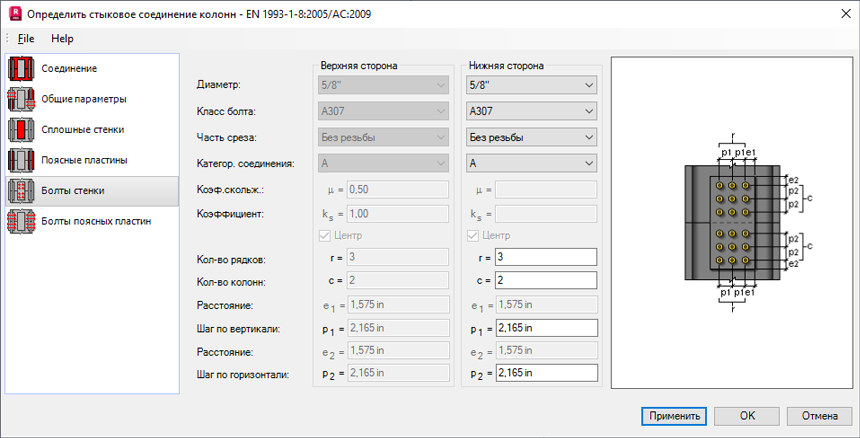 На панели "Болты стенки" указываются параметры болтов, которыми плита соединяется со стенками стержня.