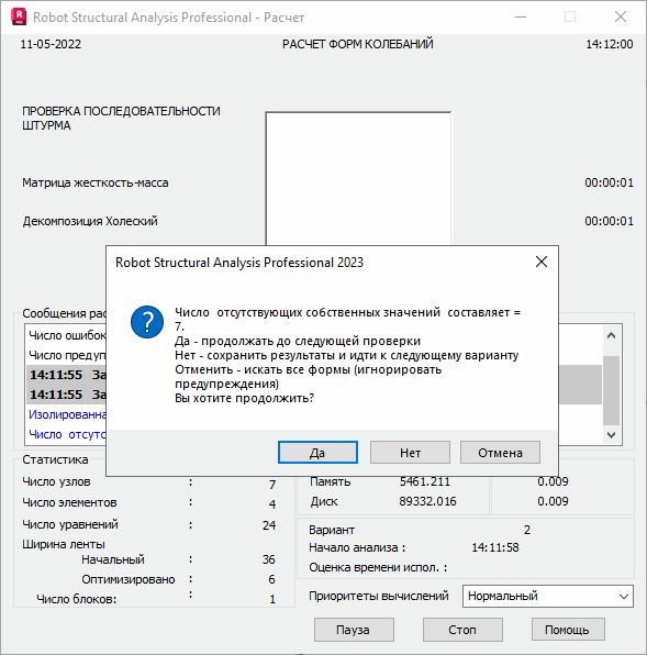 При выборе модального расчета и процент участия масс для заданного максимального числа узлов меньше, чем требуется, пользователь получает сообщение о неудовлетворительности процента участия масс, в то время как вычисления заканчиваются без внесения исправлений.