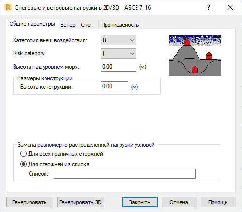 При переходе в диалоговом окне Снеговые/ветровые нагрузки на вкладку Общие параметры отображается следующее диалоговое окно: