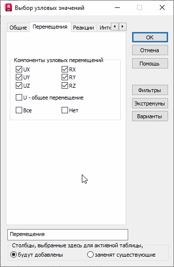 - RX, RY, RZ: при выборе, в таблицу добавляются столбцы с полученными в ходе расчета конструкции значениями вращения узлов конструкции вокруг оси X, Y или Z (соответственно) общей системы координат;