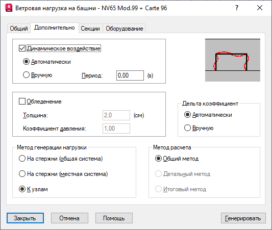 - Опция Динамическое воздействие (ветер) позволяет активизировать или отменять идентификацию динамического действия во время генерации нагрузки. Кроме того, существует возможность автоматической идентификации динамических эффектов, если определен период собственных колебаний конструкций.