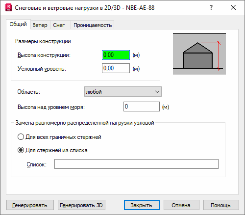 При переходе в диалоговом окне Снеговые/ветровые нагрузки на вкладку Общие отображается следующее диалоговое окно: