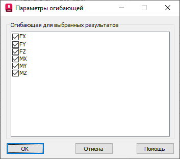 - Огибающая только для выбранных результатов – если эта опция активна, то огибающая рассчитывается только для выбранных величин (значения сопутствующих показываются для всех остальных величин). Нажмите кнопку Огибающие для того, чтобы открыть диалоговое окно Параметры огибающей со списком результатов, которые учитываются при расчете огибающей. Если отключена опция Огибающая с сопутствующими значениями, тогда будет недоступна опция Огибающая только для выбранных результатов.
