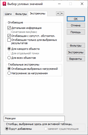 Опции огибающей используются для поиска предельных значений выбранных вариантов нагружения.