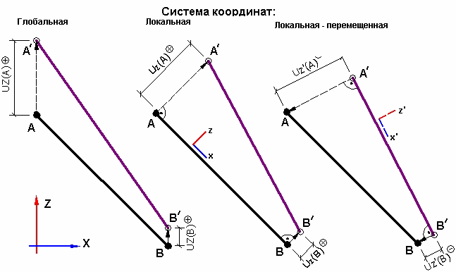 Если смещение задано в глобальной системе координат, компоненты вектора перемещения стержня (сечения стержня) AA' и BB' определяются в глобальной системе координат.