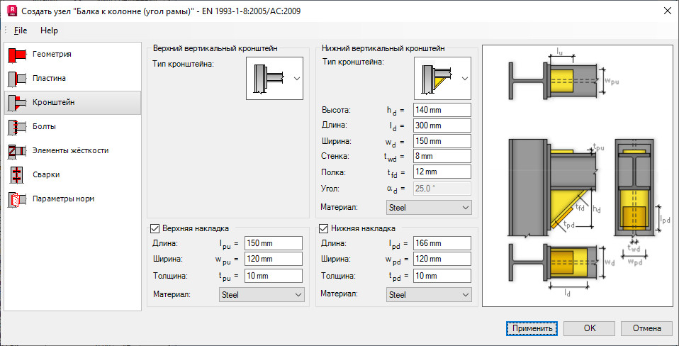 Для верхних и нижних вертикальных кронштейнов задают такие параметры: