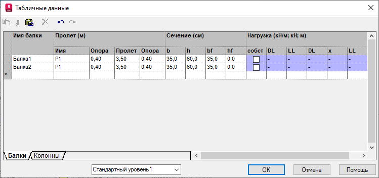 Опция используется, в основном, чтобы обеспечить возможность быстро задать вид и количество балок или колонн, для которых будет проведен расчет при соответствующей нагрузке. Диалоговое окно для определения элементов имеет две вкладки: Балки и Колонны.