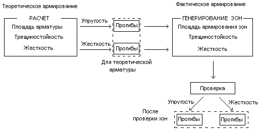Если рассчитывается площадь армирования, растрескивания, жесткости и отклонения, то имеет место проверка площади армирования по зонам. Проверка выполняется для получения окончательного значения отклонения. Новые зоны являются основой для пересчета значений растрескивания и жесткости. Дополнительную информацию об алгоритмах расчета, используемых в различных методах, см. в разделе Методы расчета отклонения в плитах и оболочках.